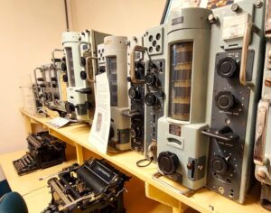 24 uur per dag werd het radioverkeer vanuit de radiohut in de gaten gehouden. Bekijk de vele zenders en ontvangers en sein je naam in het beroemde morse-alfabet!